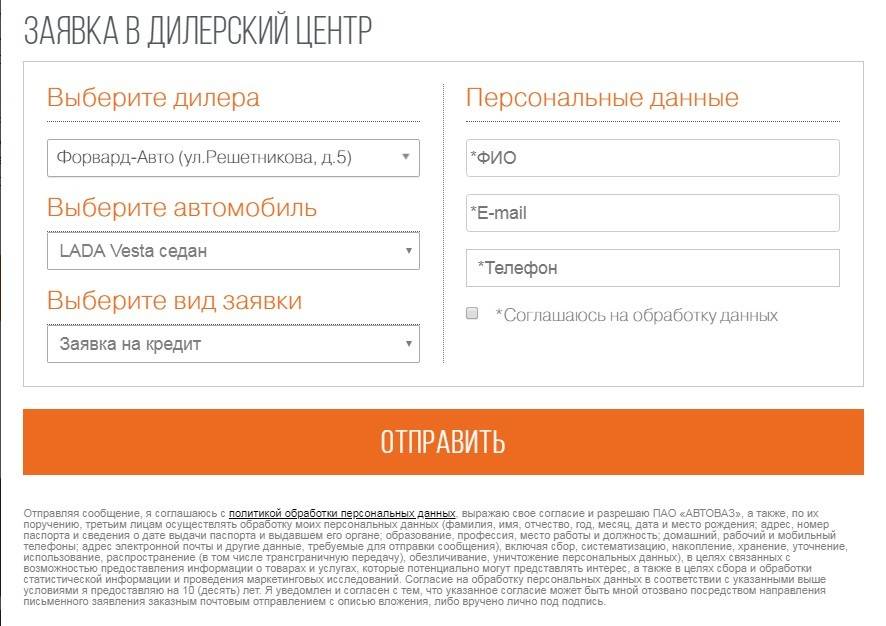 Новая ЛАДА Веста в кредит по системе Buy-back приобретается через заявку в дилерский центр. Необходимо указать подходящий автосалон, выбрать модификацию ТС и ввести свои персональные данные.
