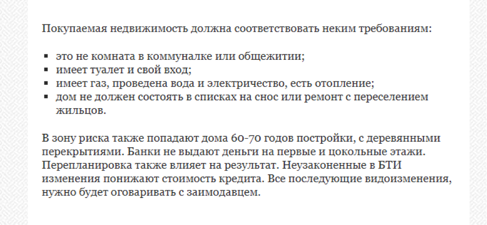 Если залогом выступает уже имеющаяся у клиента недвижимость, то она должна отвечать таким требованиям: