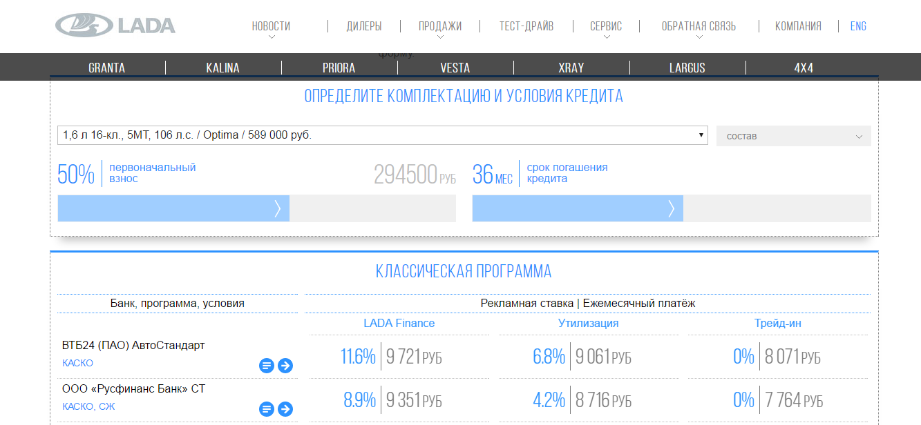 Естественно, каждый случай индивидуален, однако необходимо проанализировать наиболее вероятные сценарии. Стандартным вариантом является внесение 50% суммы (294 500 руб. за базовую версию) и рассрочка на 36 месяцев. В данном случае процентные ставки будут минимальны – от 7.7% (ООО «Русфинанс Банк» СТ) до 11.8% (АО ЮниКредит Банк Lada стандарт СЖ (12.8% без КАСКО)). Эти условия действуют при условии внесения первоначальной суммы от 30%.