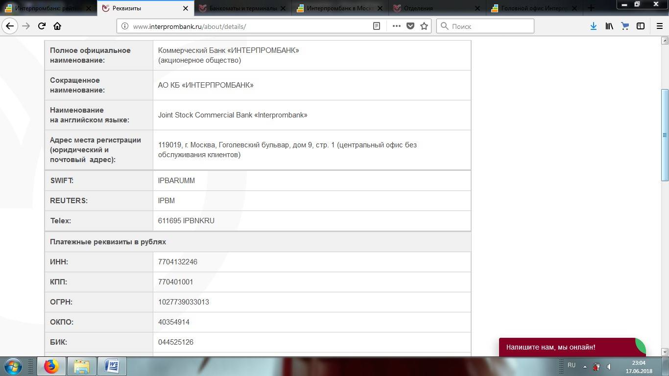 Интерпромбанк Реквизиты: Банк имеет полное наименование «коммерческий банк Интерпромбанк» Акционерное общество платежные реквизиты в рублях ИНН 77 04 13 22 46, если отправлять валюту в долларах, то реквизиты проходят по ВТБ bank Evrope SS. Его же принимает в валюте евро.
