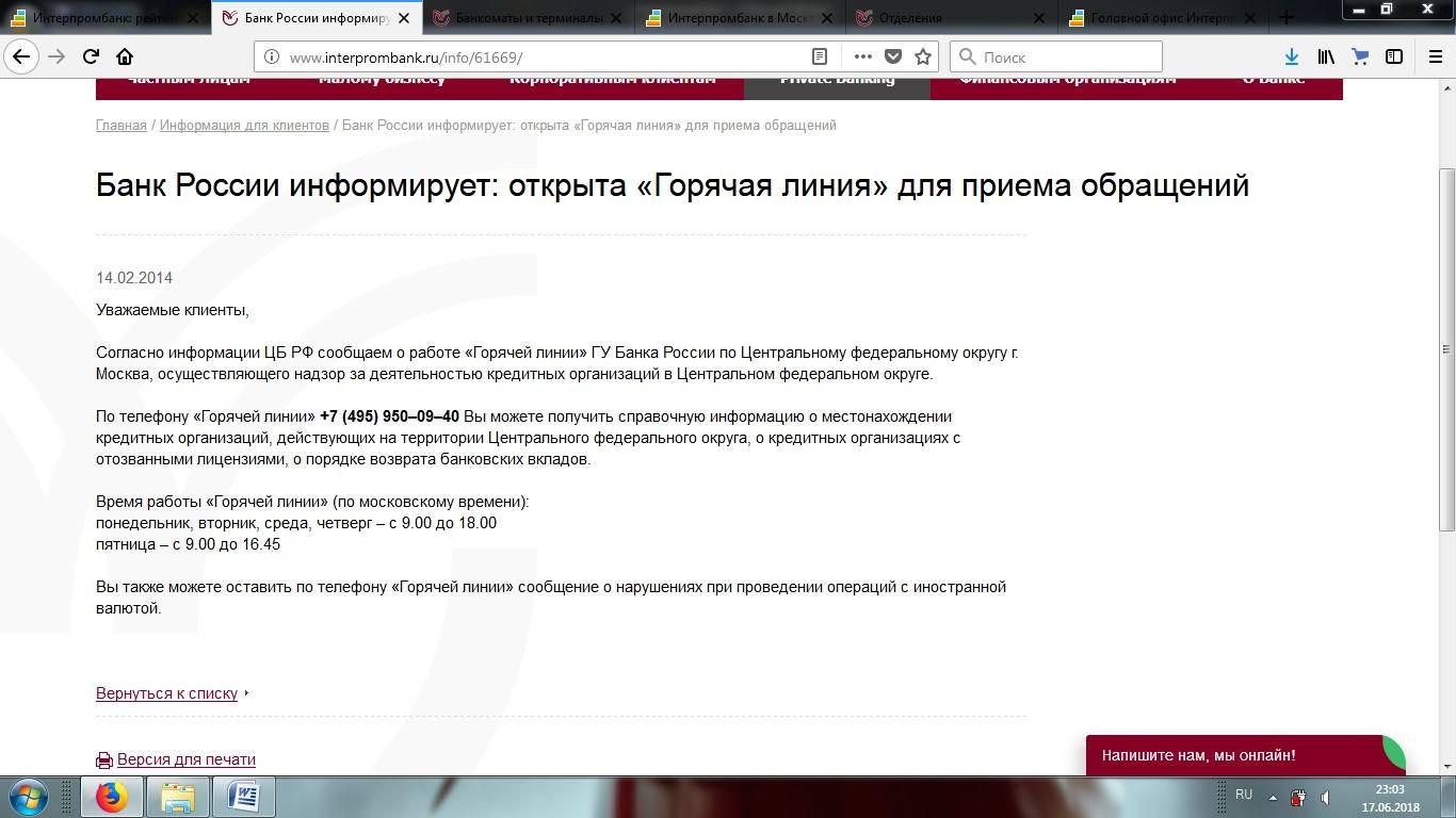 Клиенты могут задать свои вопросы, обратившись в Интерпромбанк номер телефона +7 (495) 232 2050. С Вами свяжется менеджер и ответит на все вопросы. Кроме того, можно позвонить в Интерпромбанк на горячую линию круглосуточной службы поддержки клиентов +7 (495) 232–2050, +7 (495) 232–0215. Здесь можно получить справочную информацию о местонахождении банкоматов, кредитных организаций, а также филиалах.