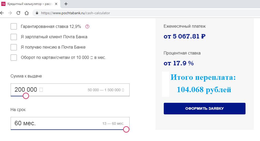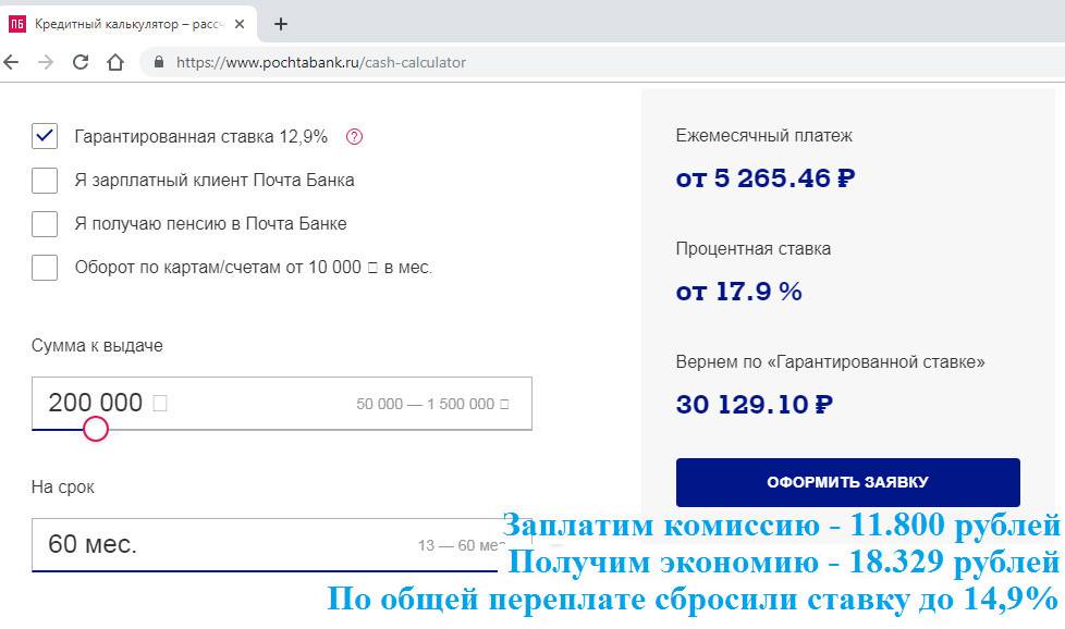 В Почта Банке на кредитном калькуляторе можно посчитать, какую экономию вы получите, используя Гарантированную ставку, единственный его недостаток — в программе дата оформления договора и получения услуги совпадают.