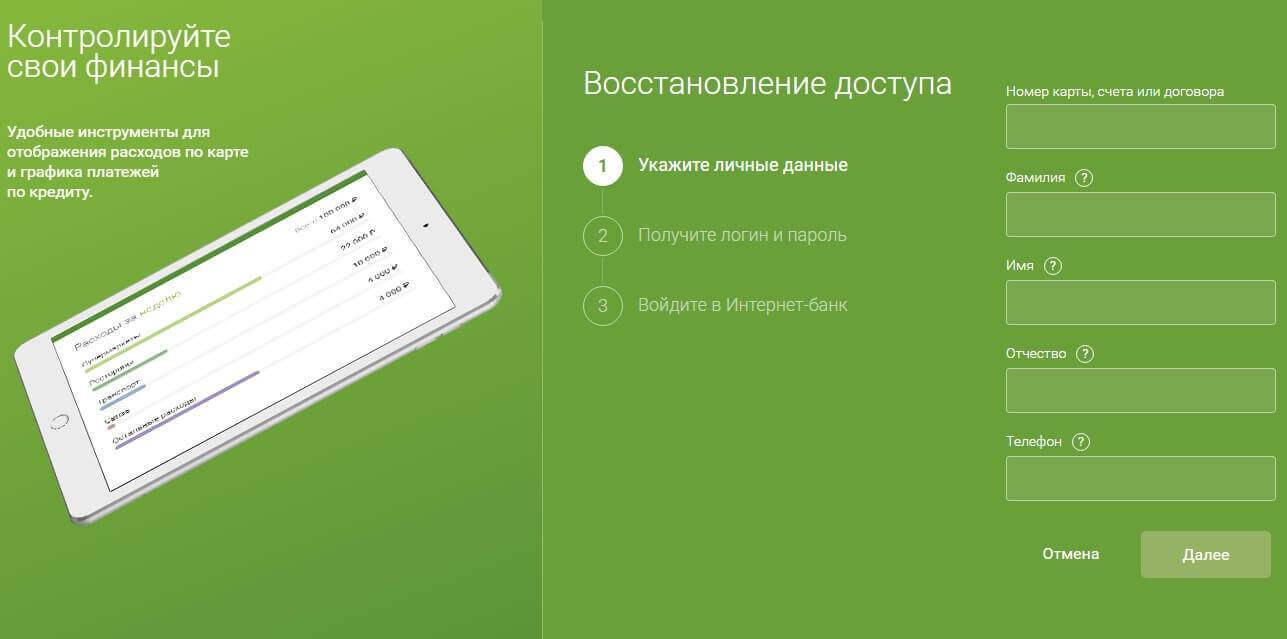 Далее клиент указывает свои личные данные и вводит номер телефона, который он указывал при оформлении договора с финансовым учреждением.