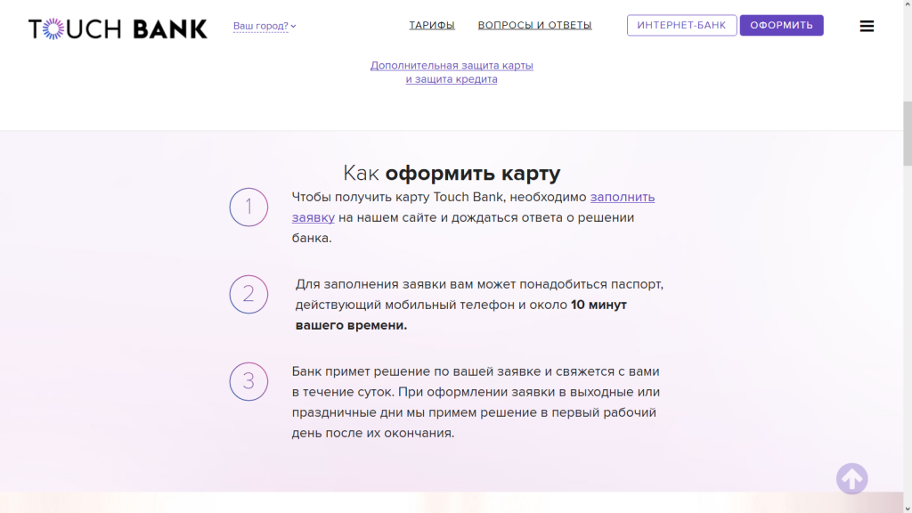 Чтобы отправить в Тач Банк онлайн заявку на кредитную карту, необходимо: