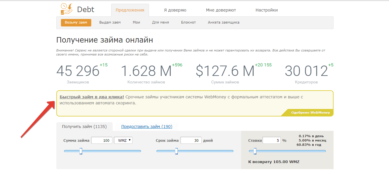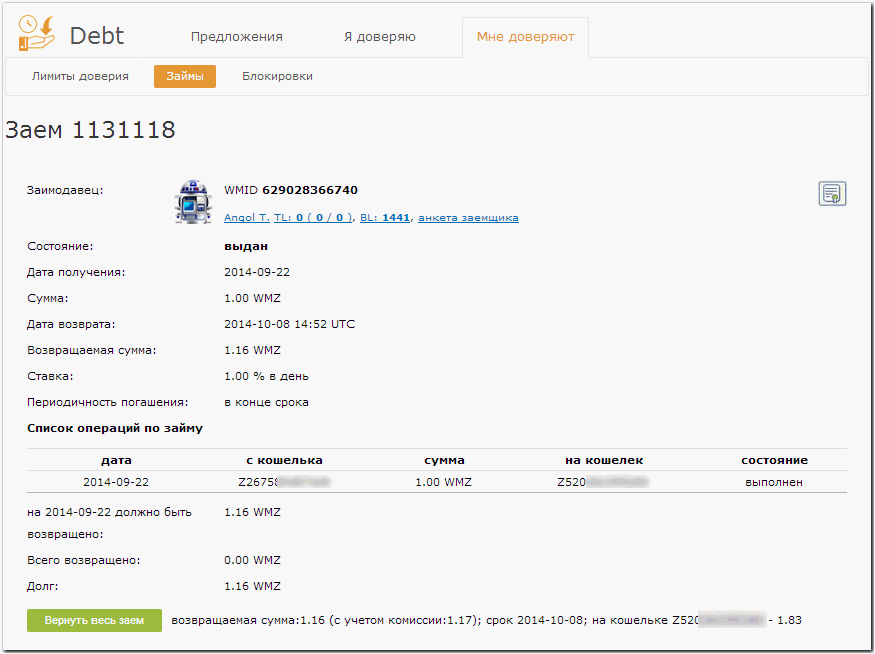 Важно: помнить, что все операции по займам необходимо выполнять посредством Долгового сервиса Debt. Пример получение займа на Вебмани смотрите в этом видео: