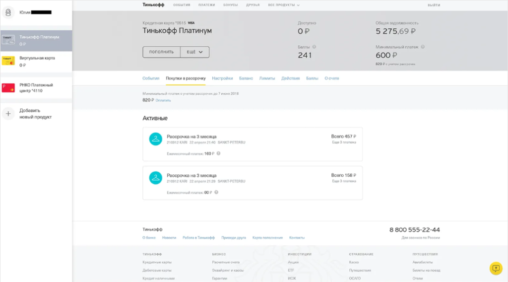 Рассрочка в Тинькофф банке рассчитывается довольно просто — берется сумма покупки и делится на количество месяцев рассрочки (у каждого магазина-партнера свой срок). Так получается ежемесячный платеж по рассрочке.