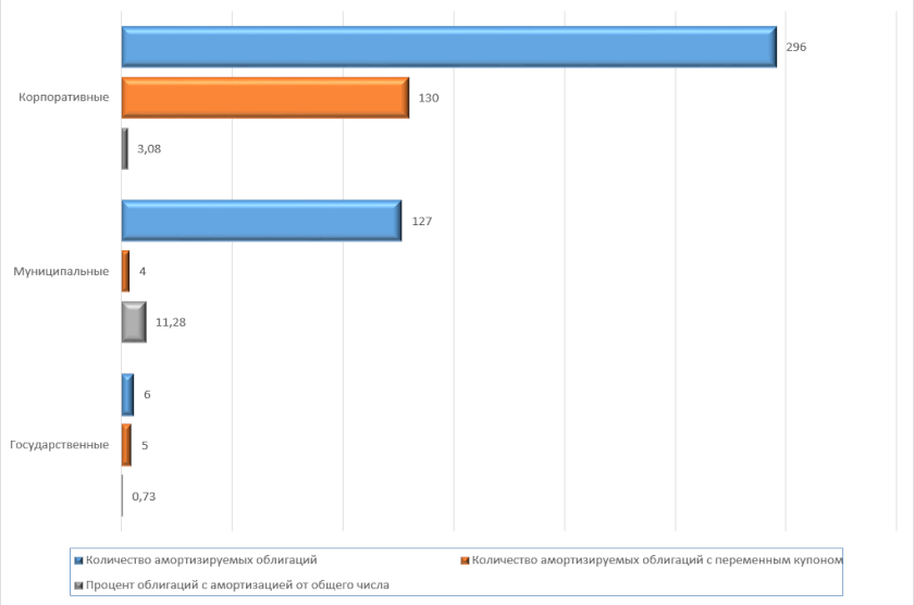 Из примерно 300 корпоративных облигаций с амортизацией долга, с переменным купоном насчитывается более 130. Применительно к муниципальным, облигаций с переменным купоном всего 4. Следует также отметить, что практически у всех муниципальных бумаг есть амортизация долга