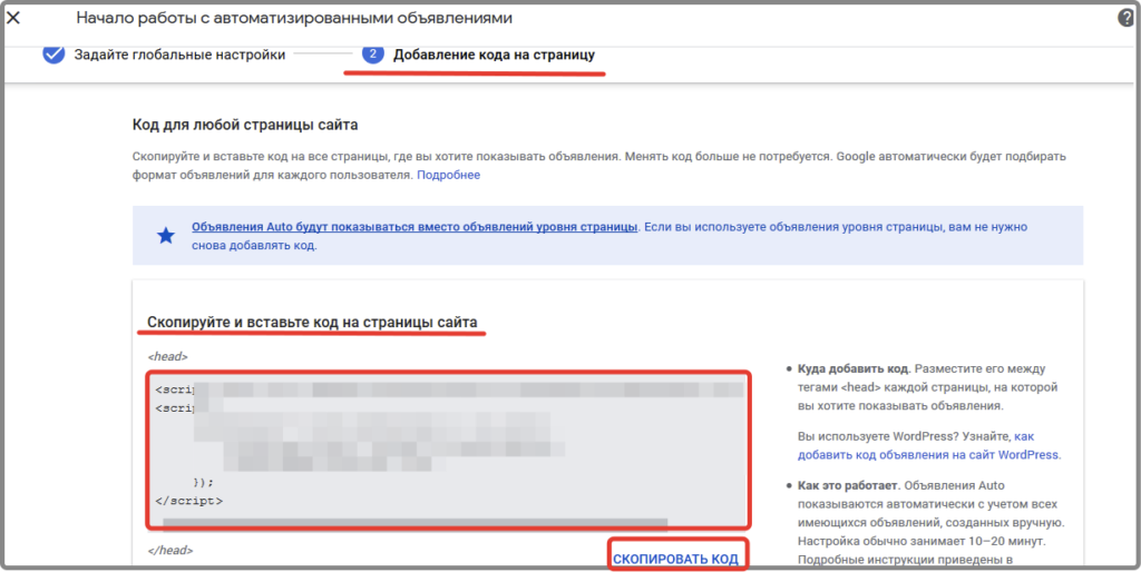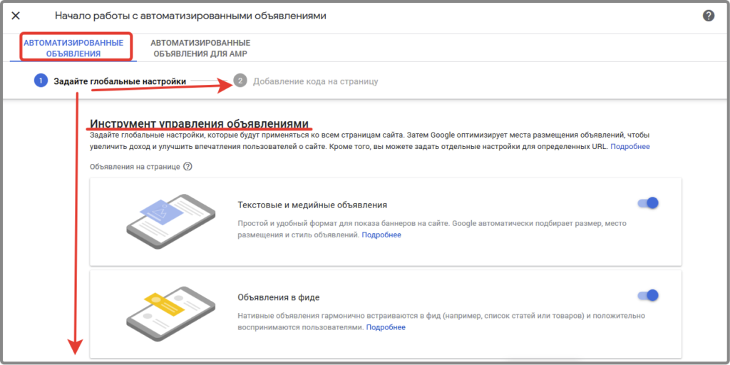 Если код не внедряли и хотите внедрить, то после настройки и сохранения, как ни парадоксально, жмёте “настроить автоматизированные объявления” и получаете код, который размещаете вышеуказанным методом. На этом настройки завершены.