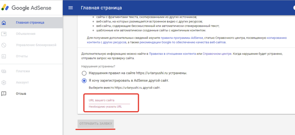 Если у вас уже есть аккаунт в Google AdSense. Кратко снова опишу свой случай. Для обучения в том нехорошем проекте, пыталась добавить тот блог. Не удалось этого сделать и с 4-ой попытки. Тогда был один ответ: недостаточно контента. Если у вас ситуация в чём-то схожа, то следующие скрины лишними не будут.