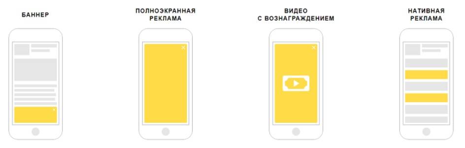 - Баннер. В AdSense показывается показа вверху и внизу экрана, а в РСЯ встраивается в контент приложения или открывается поверх него.