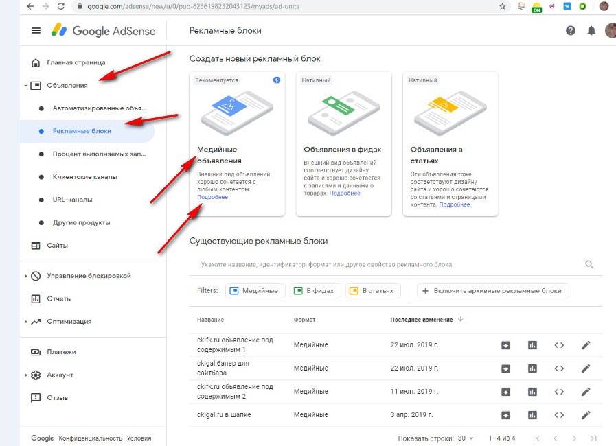 Слева в аккаунте жмём “Объявления”, ниже “Рекламные блоки”, и вверху слева нажимаем “Новый рекламный блок”