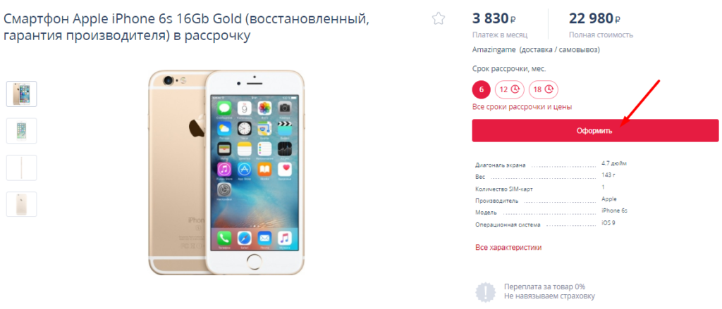 При выборе конкретного товара система рядом с полной стоимостью укажет примерный ежемесячный платеж и допустимый срок рассрочки. Ниже приводится список других магазинов, готовых продать аналогичный предмет. Как только найден оптимальный вариант, можно приступать к непосредственному оформлению услуги. Для этого кликаем на кнопку «Оформить» и действуем.