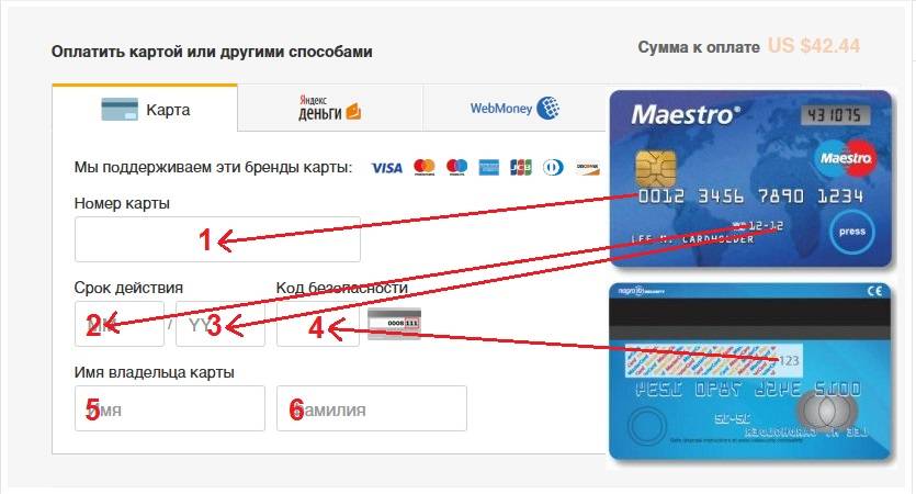 - пропишите реквизиты, необходимые для совершения транзакции – номер и дату окончания действия карты, имя владельца и трехзначный код безопасности, указанный на обратной стороне пластика;