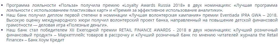 В следующем году в перечень услуг были включены и зарплатные проекты. Также Хоум Кредит Банк ввел массу удобных дополнительных услуг, которые упрощают работу с банком. Клиентам предложили пользоваться банкингом, а также подключают для них удобную систему СМС-информирования.