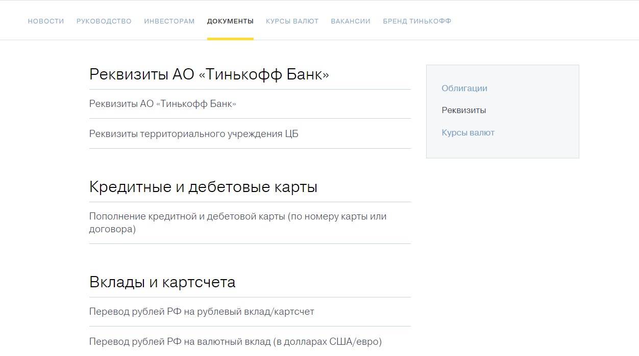 Реквизиты Тинькофф банка для физических и юридических лиц для переводов в рублях