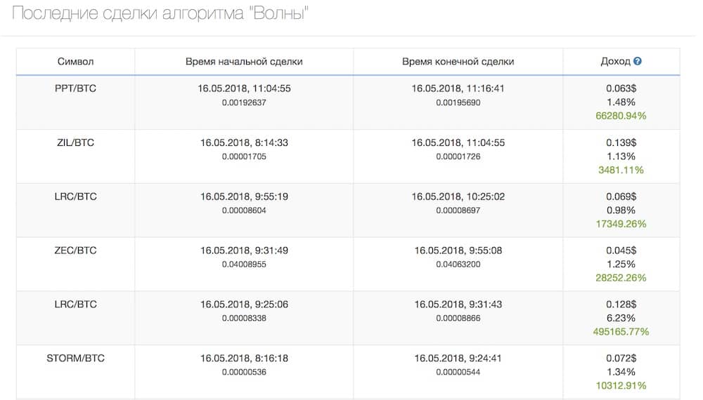 Скрипт автоматизации, с торговым алгоритмом «Волны», может совершать несколько сделок в секунду, что обычному живому трейдеру недоступно. Средняя суточная прибыль, при использовании данного алгоритма автоматизации составляет 0,5-3%. То есть если у вас на балансе биржи был 1 биткоин, то через сутки там будет 1,03 BTC. А через месяц будет сумма близкая к двум биткоинам.
