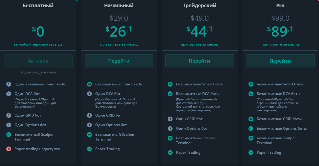 Самый выгодный тариф Pro на нём вы получите доступ без ограничений для торговли ботами на крипте. На первый взгляд кому то может показаться что тариф дороговат, но именно этот тариф позволяет зарабатывать с помощью ботов максимальную прибыль круглосуточно. Выбирать конечно вам. При оплате тарифа на год, вы получаете существенную скидку.
