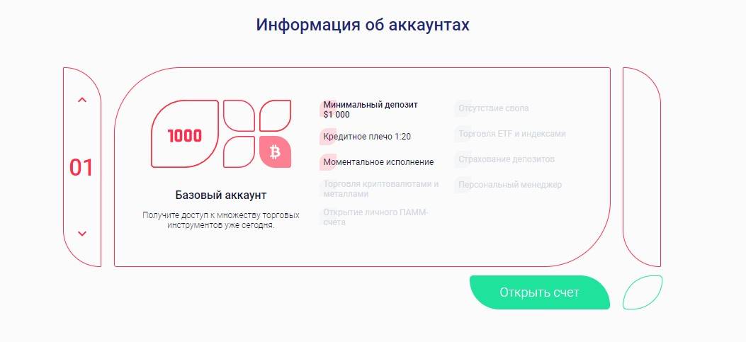 На сайте сообщается, что компания предлагает три аккаунта на выбор. Стартовать можно с 1000 долларов. Кредитное плечо — 1:20. Чем больше пользователь вкладывает, тем больше преимуществ получает. Это тмаркетинговый ход, который любят мошеннические компании. Клиент видит, что вложив 50 тыс. долларов он может получить и услугу страхования, и персонального менеджера, и защиту собственных средств и стремится к этому, постепенно повышая размер депозита. А мошенникам именно это и нужно!