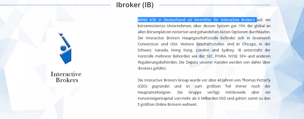 Компания “Банкс брокер” зарегистрирована в Дюссельдорфе (Германия). Она принадлежит зонтичному бренду Interactive Brokers. Главный офис материнской компании расположен в Великобритании. Также есть подразделения в США, Канаде, Швейцарии и Гонконге. Главный акционер и генеральный директор — Томас Петтерфи.
