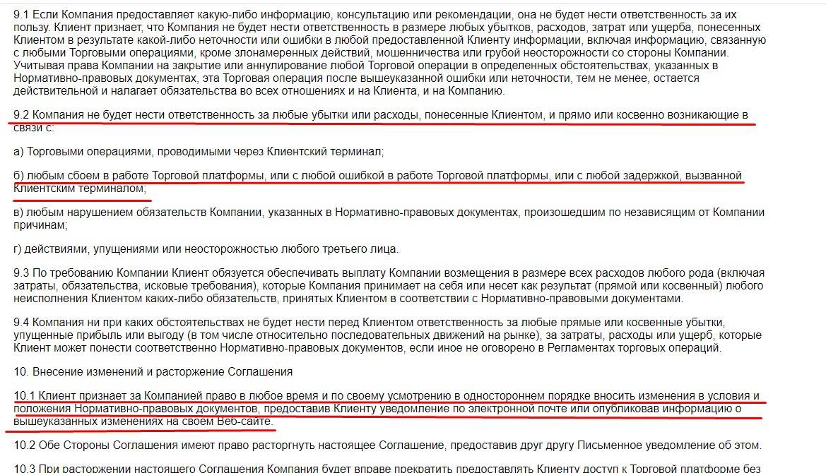 Перед началом сотрудничества настоятельно рекомендуем ознакомиться с Пользовательским соглашением SVV Pro. Там черным по белому написано, что брокер может по своему усмотрению распоряжаться счетами трейдеров, при этом права последних жестко ограничиваются. В случае возникновения каких-либо нарушений компания нести за них ответственность не будет. Также сообщается, что брокер в одностороннем порядке может вносить изменения в Пользовательское соглашение, информируя о них на веб-сайте. Подписавшись на подобные условия пользователь сам того не понимая обрекает себя на потери.
