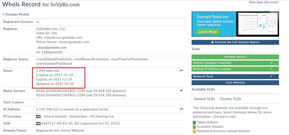 Мы проверили информацию через сервис Whois. В результате оказалось, что домен был зарегистрирован в 2017 году, но обновлен в 2021-м. Адрес перекупили.