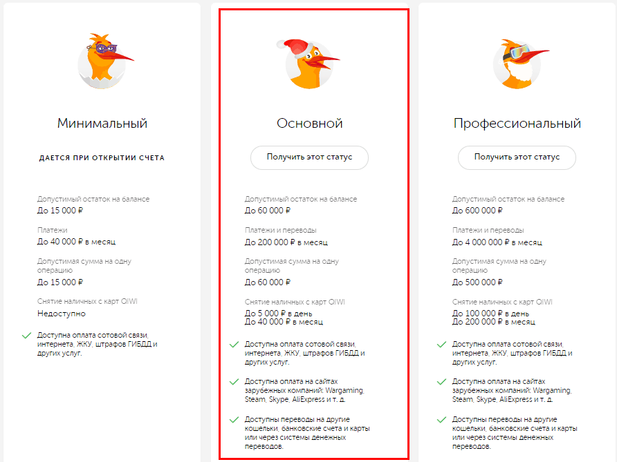 Каждому пользователю ПС присваивается статус – “Минимальный”, “Основной” или “Профессиональный”, в зависимости от представленных сведений. Статус «Минимальный» дается после регистрации, со скромными лимитами (размещение до 15 000 р. на счету, ограничение на транзакцию – 15 000 р., обналичивание лимита – до 5 000 р. в сутки) и не принимается кредиторами. Получить микрозайм на такой кошелек невозможно.