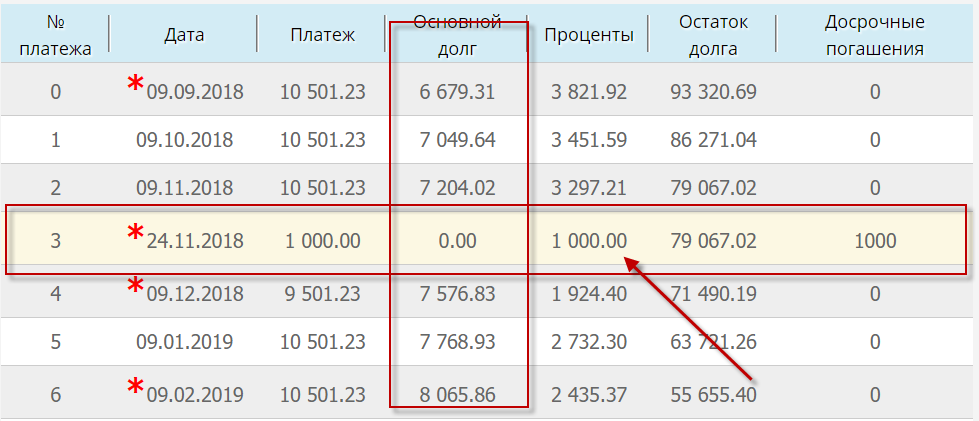В столбце проценты — наша 1. тыс. рублей, она пошла на выплату процентов. В столбце остаток долга — нуль. После досрочного погашения ежемесячный платеж не изменился и остался тем же(первый столбец).