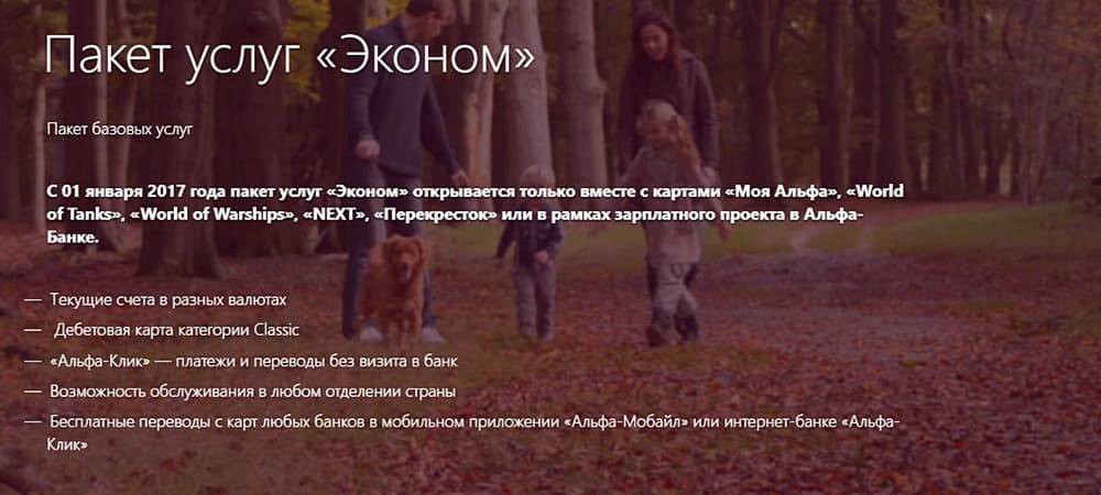 - «Эконом». Годовая оплата — 959 руб. В стоимость входит базовый набор услуг: подключение сервиса “Альфа-Клик”, работа с 3 счетами в 3 валютах (рублях, евро и долларах). Если на счете больше 30 тыс. руб., за обслуживание платить не нужно.