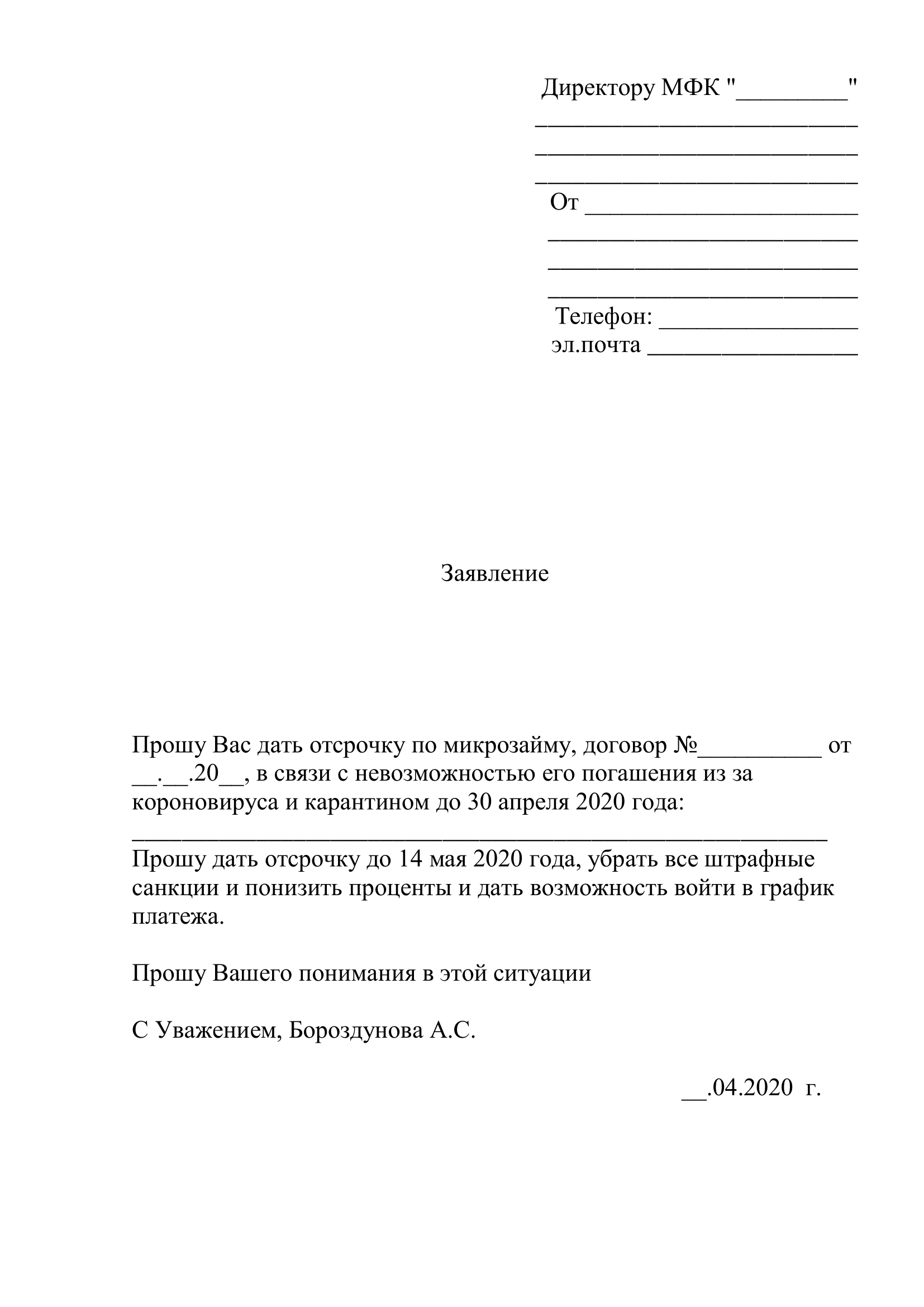 Пример заявления на реструктуризацию займа в связи с коронавирусом.