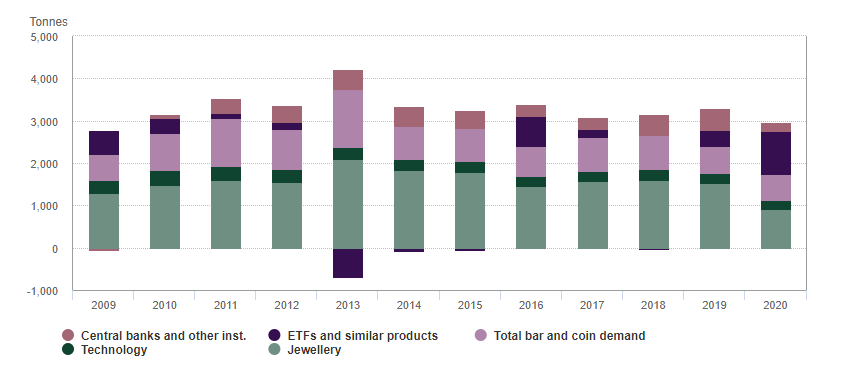 Хотя спрос на ювелирные изделия улучшился в сравнении с рекордным минимумом во втором квартале, сочетание продолжающихся социальных ограничений, экономического спада и высоких цен на золото оказались обременительными для многих покупателей ювелирных изделий: спрос составил всего 333 тонны, что на 29% ниже чем в 2019 году.