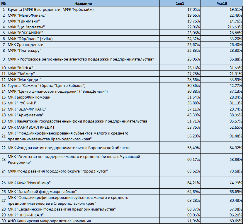 Неудивительно, что в таких условиях небольшие игроки в массовом порядке потянулись на выход. Количество участников государственного реестра МФО во втором квартале сократилось на 68 организаций, до 1660, или на 4%. При этом количество МФК выросло с 35 до 36, на них, несмотря на малочисленность, по-прежнему приходится около половины совокупного портфеля микрозаймов.