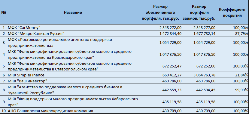 Таблица 3. ТОП портфелей компаний, выдающих займы с обеспечением