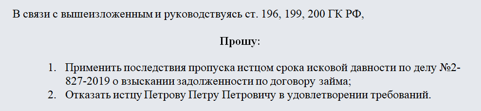 Пример формулировки в ходатайстве о применении сроков давности в суде