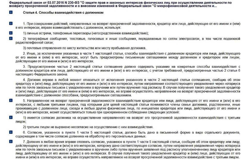- № 230-ФЗ от г. «О защите прав и законных интересов физических лиц при осуществлении деятельности по возврату долгов»,