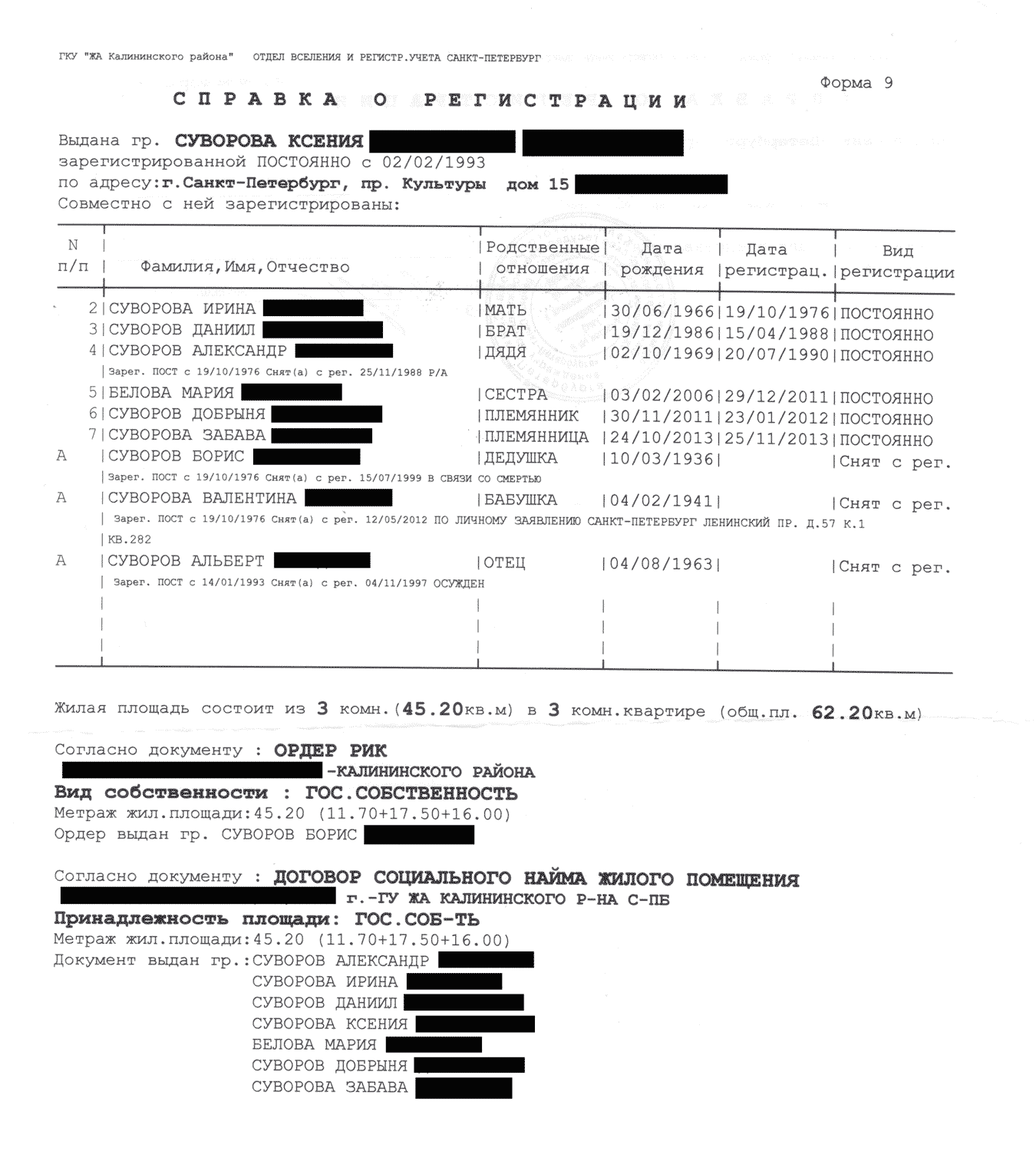 Форма № 9: справка о регистрации. В ней можно узнать метраж и количество прописанных человек. Кроме того, этот документ необходим, чтобы попасть в очередь на квартиру. Справку получают в отделении вселения и регистрационного учета граждан (бывший паспортный стол). Для получения достаточно паспорта