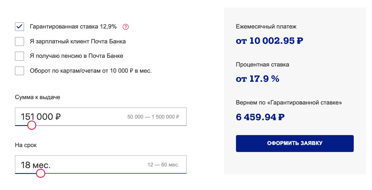 Наиболее выгодные условия предоставляются зарплатным клиентам. Также они могут быть предусмотрены для физических лиц, имеющих кредитные карты в «Почта Банке» и благоприятную историю. Использование «Гарантированной ставки» позволит дополнительно сэкономить на переплате: после полного погашения займа ставка уменьшается, и часть уплаченных средств возвращается на банковский счет.