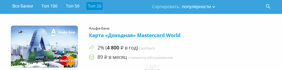С учетом кризисного состояния российской банковской системы последних 2-3 лет, когда лицензии теряют около 100 банковских организаций в год, стоит ориентироваться на ТОП-20. Дополнительное меню «Сортировать» позволяет также сортировать банки по популярности, кешбеку, названию банка, рейтингу проценту на остаток и пр.