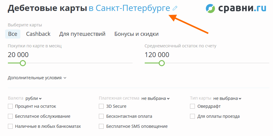Тогда как в сервисе сравни.ру выбор города находится в подменю, т.е. после нажатия на главной странице на пункт «Дебетовые карты»: