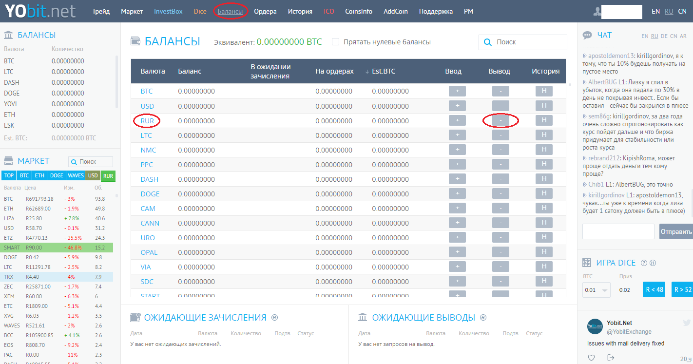 Следующий шаг – вывести биткоин с YObit. Снова идем на вкладку «Балансы», находим RUR, только на этот раз выбираем «вывод».