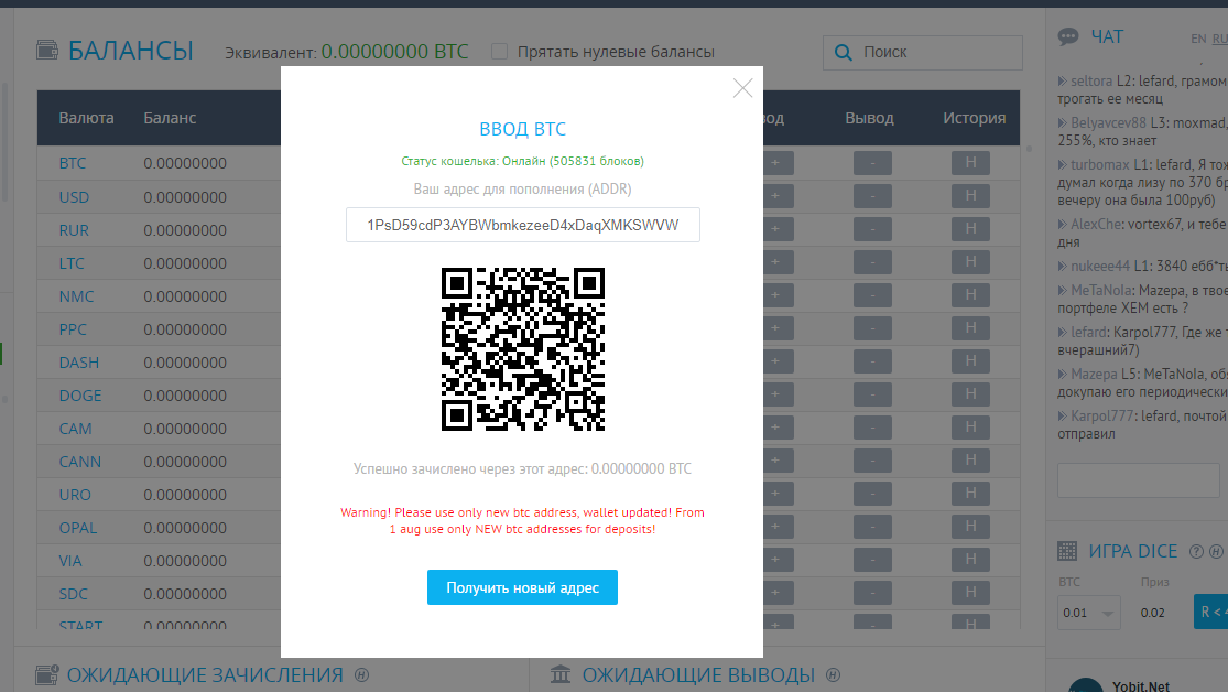 YObit сгенерирует адрес для перевода в виде QR-кода или набора символов. Его необходимо ввести в биткоин кошельке, или другой бирже. После этого деньги через определенное время будут зачислены на баланс YObit.