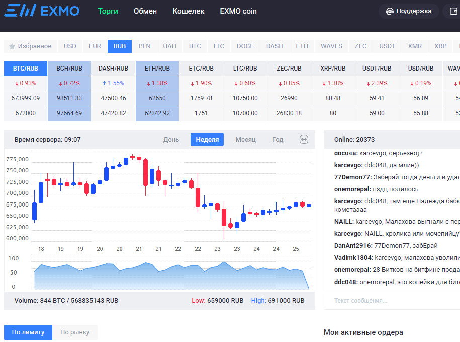 | EXMO | 7 | Нет | С карт Visa и MasterCard, AdvCash, Яндекс.Деньги, QIWI, Payeer, EX-CODE | 24. Самые популярные – BTC/RUB, ETH/RUB, XRP/RUB |