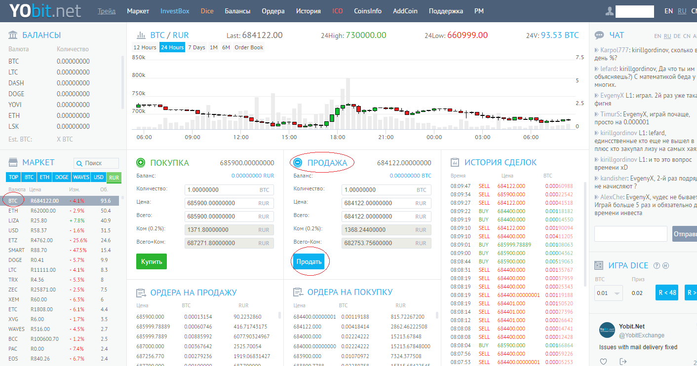 Далее переходим на вкладку «Трейд», снова выбираем BTC и создаем ордер на продажу за рубли. Стоит учесть, что YObit взыщет 0,2% комиссии от суммы торговой операции.