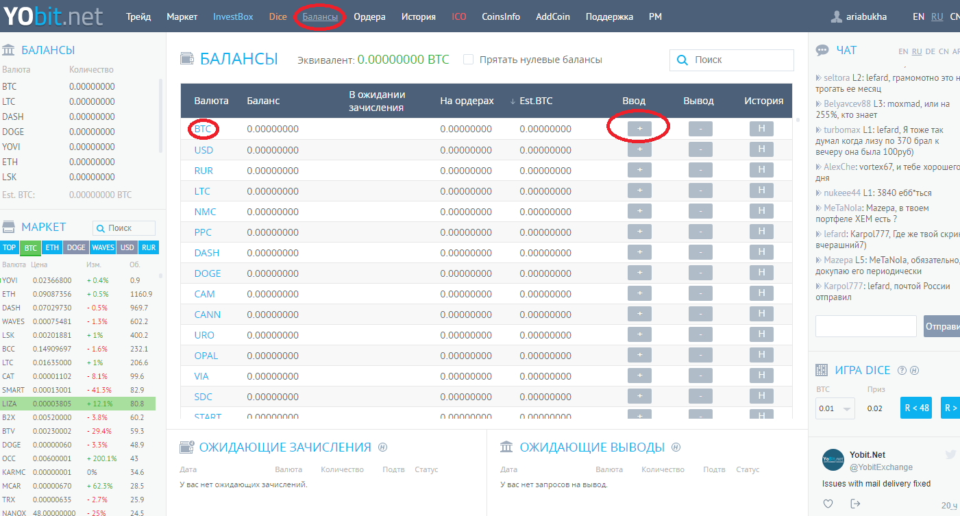 Регистрация на YObit очень проста. Все что нужно сделать – придумать логин и пароль, указать почтовый адрес и заполнить капчу. Прежде чем bitcoin превратится в наличку, потребуется сделать еще несколько шагов. Первый, завести его на биржу. Для этого нужно зайти на вкладку «балансы», найти BTC и нажать ввод.