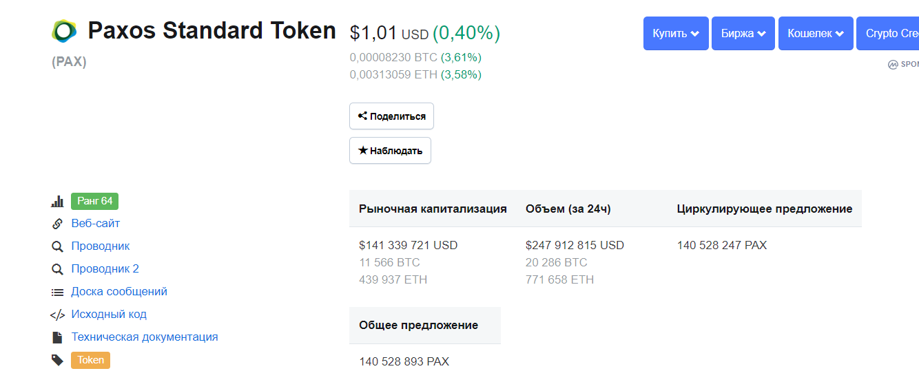Стейблкоин PAX обеспечен американским долларом в пропорции 1:1. По состоянию на 27 июня криптовалюта находится на 64 позиции рейтинга капитализации ресурса CoinMarketCap. Стейблкоин представлен на 38 биржах. Его капитализация на момент написания новости составляет $141 339 721.