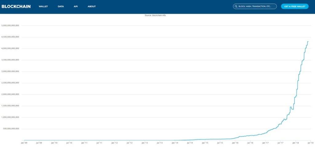 График показывающий постоянно увеличивающуюся сложность добычи криптовалюты Биткоин за все время существования монеты