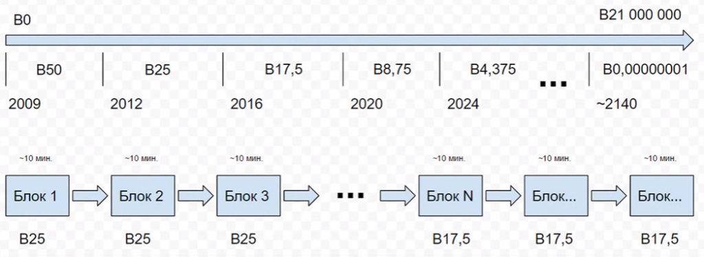 - Награда за блок уменьшается вдвое примерно каждые 4 года.