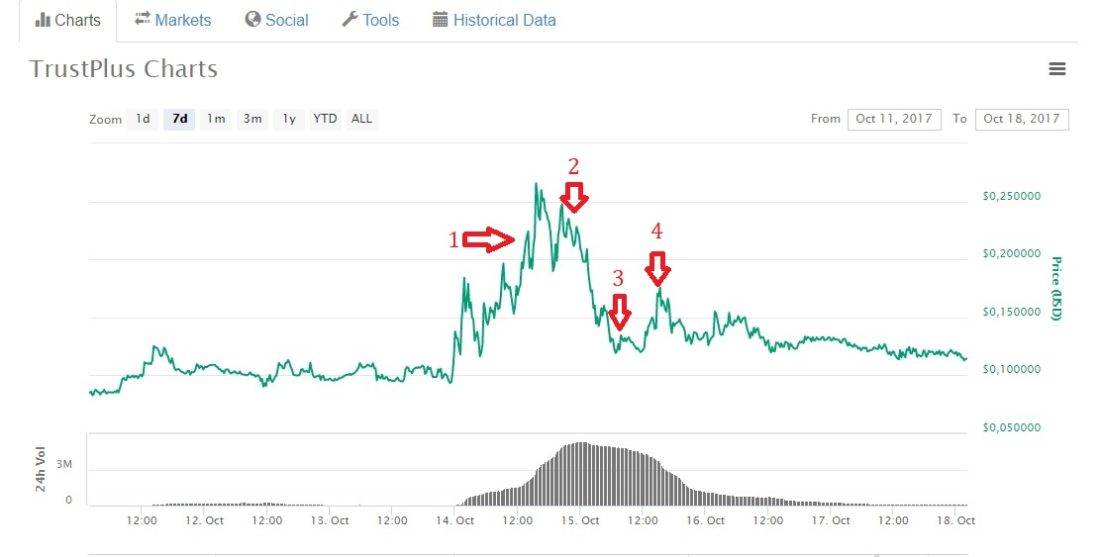 Заработок на “длинном” пампе теоретически возможен – у трейдеров, успевших купить валюту во время пампа (точка 1 на графике TrustPlus ниже) и максимально быстро ее продавших, есть шанс получить прибыль (в среднем около 30-40%). Однако реально на выставление ордера есть считанные минуты.