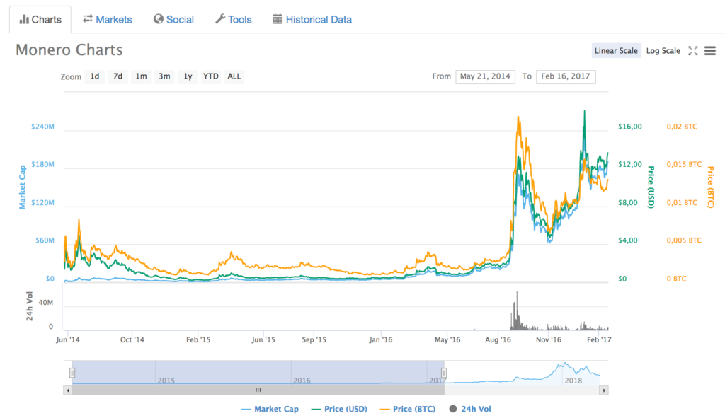 На графике представлена ситуация по криптовалюте Монеро. В октябре 2016 года наблюдался резкий рост интереса к монете. На графике виден существенный всплеск объёмов. К 2017 ситуация сильно меняется, и цена практически возвращается на прежние уровни.