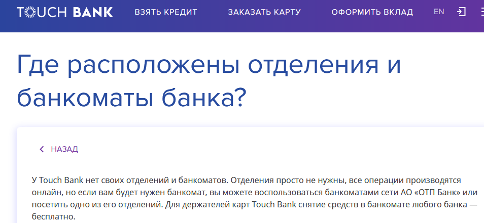 Онлайн-банк, работает под крылом ОТП банка. Заключая договор на обслуживание с Тач банком, по факту вы обслуживаетесь в ОТП.