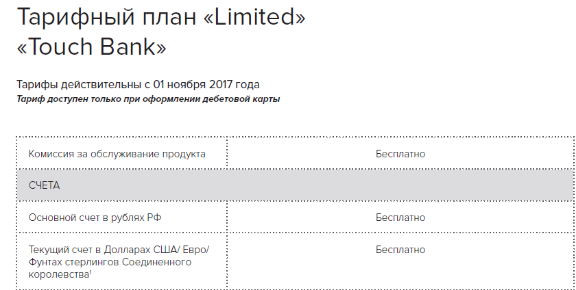 Имеется два тарифа по дебетовым картам Touch Banka, лимиты и условия по которым отличаются.